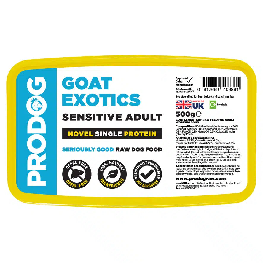 ProDog's Goat Exotics meal is a novel protein raw dog food recipe made with premium, pasture reared goat meat and ground goat bone, responsibly sourced for trusted quality. Blended with a sprinkle of seasonal leafy greens, kelp, inulin, and enhanced with flaxseed and hemp oil. Vet-approved and canine nutritionist formulated, it’s designed for working dogs with intolerances or sensitivities to commonly farmed meats. Single protein, naturally tasty and packed with powerful natural nutrition.